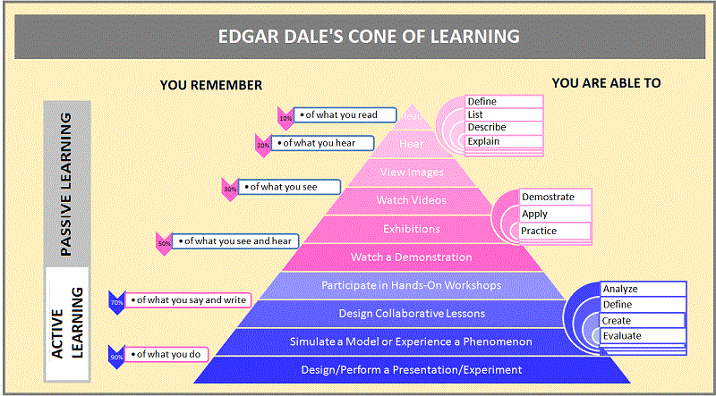 Yes, is the simple answer. Alike studies directly investigating deep learning, research on active learning suggests that it generally enhances and produces superior learning. In fact, statistically analysing 253 active learning studies, Hattie claims that active learners perform approximately a grade and a half better than controls. The Learning Cone developed by Edgar Dale – below – nicely summarises the features and outcomes of active/deep learning as well as the importance of these approaches for retention.