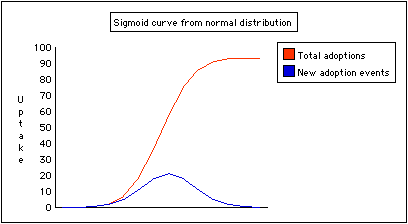 In fact you will get a sigmoid curve for cumulative adoption if the underlying rate of new adopters (new adoption events) forms a normal distribution (and if there is no significant rate of people dropping the innovation).